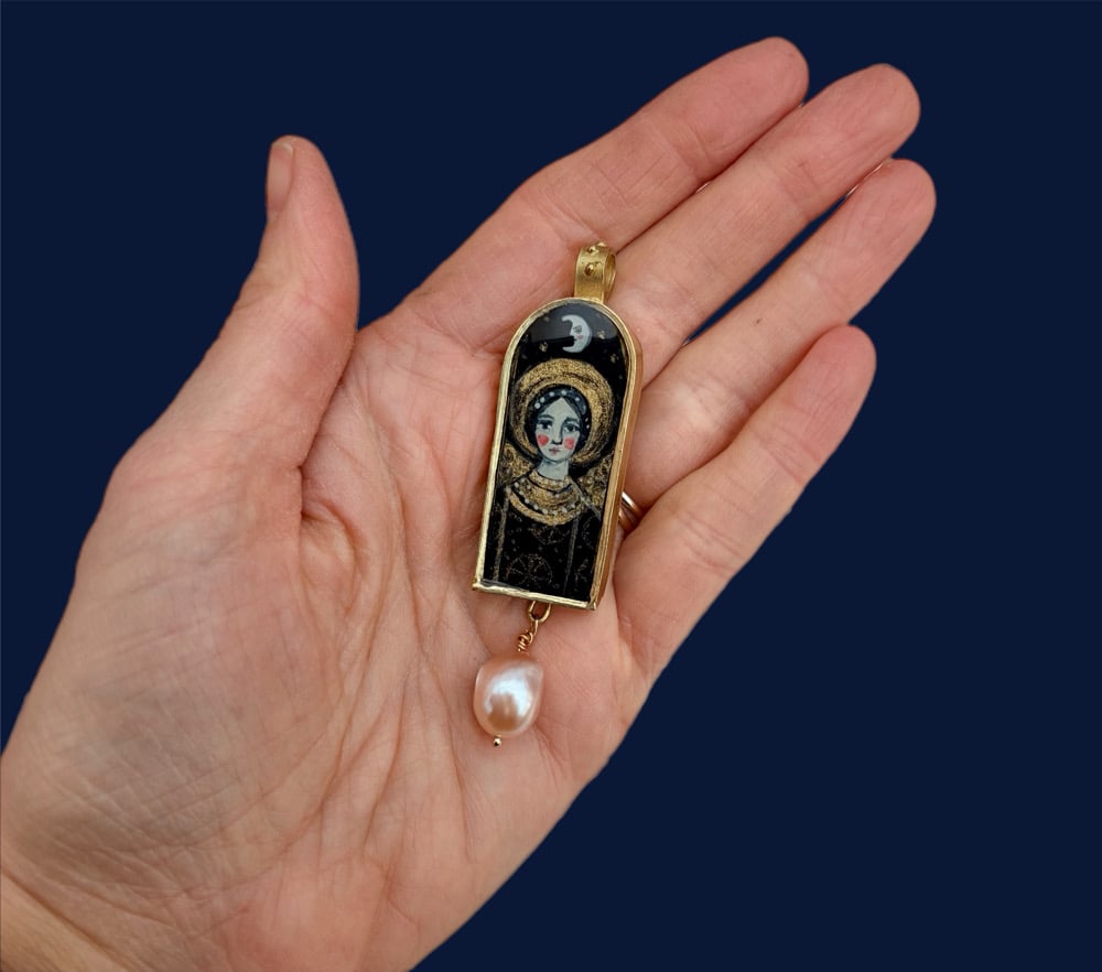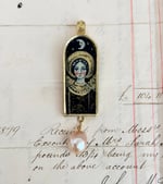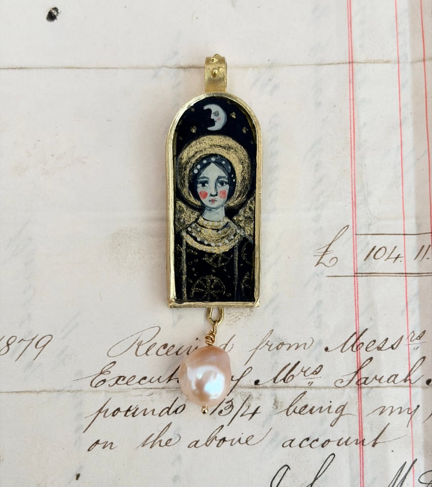 This pendant has an individually painted small angel icon set within it. The angle is set against a moonlit starry sky. The frame is made from brass and has a freshwater pearl hanging from it.