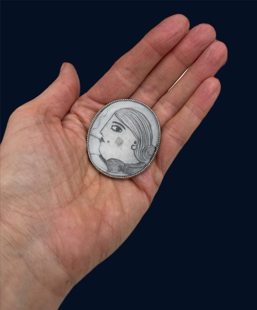 This smoking lady has lots of character. The image is a dry point etching set within a vintage frame.