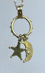 This moon and star pendant are individually hand made. They hang from a ring which can be worn on a chain. It’s a great way to hang a variety of charms and it looks lovely on a long chain.