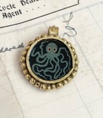 This pendant houses a sweet little octopus. He’s encased within a brass frame. He’s hand painted and is a unique one of a kind piece.