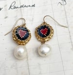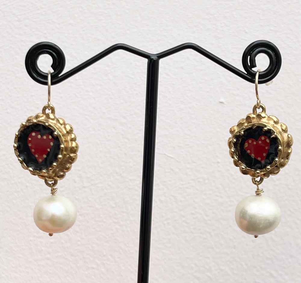 These pretty heart earrings have hand painted centres and are set within gold plated brass. Both earrings have large freshwater pearls hanging from them.
