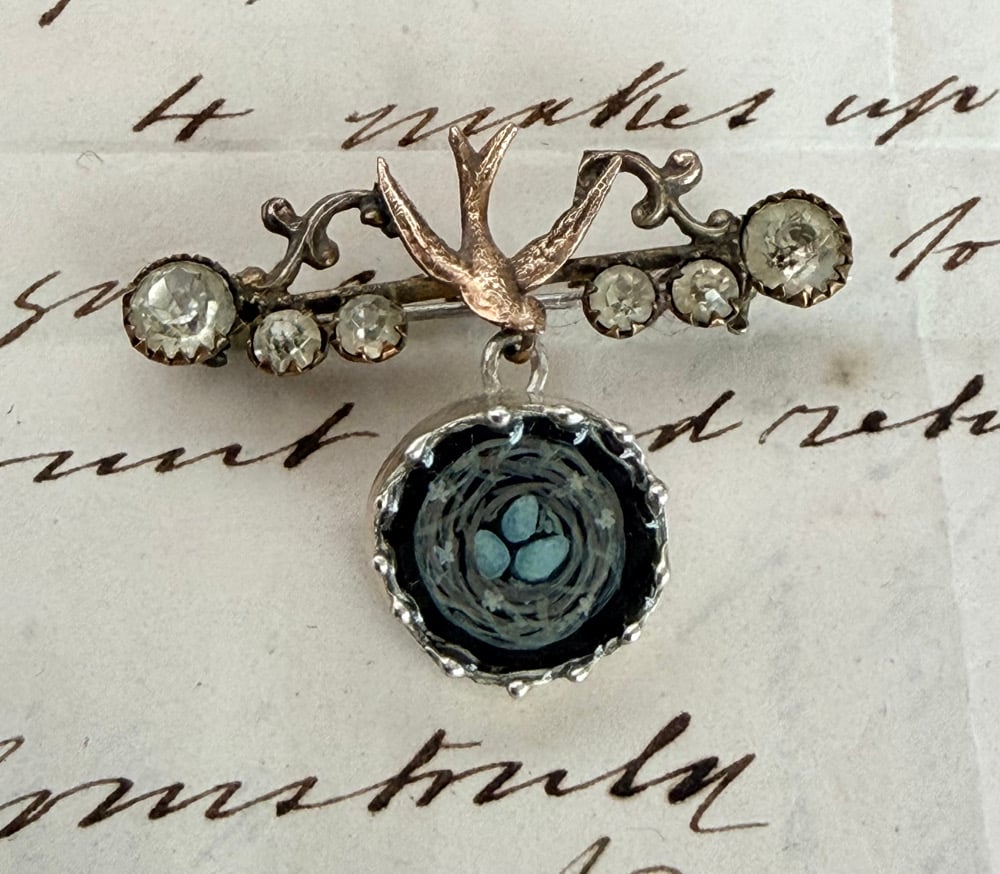 This little brooch is a marriage of two parts. The main brooch dates from the Victorian period. It’s set with sparky paste stones and has a small sculpted swallow in the centre. I have made a small silver case which houses a hand painted nest. The nest contains three tiny blue eggs and is edged with tiny white flowers.