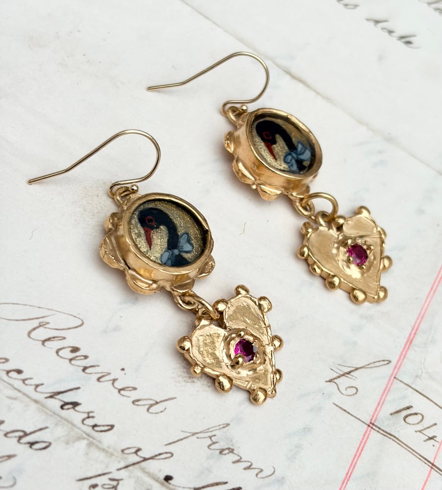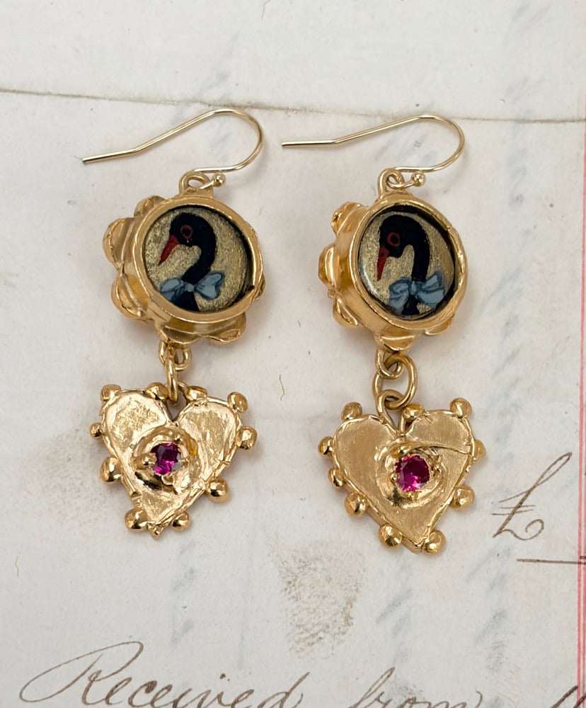 painted black swans set within a brass frame. The swans have beautiful blue bows tied around their necks. Below are two hearts set with tiny rubies.