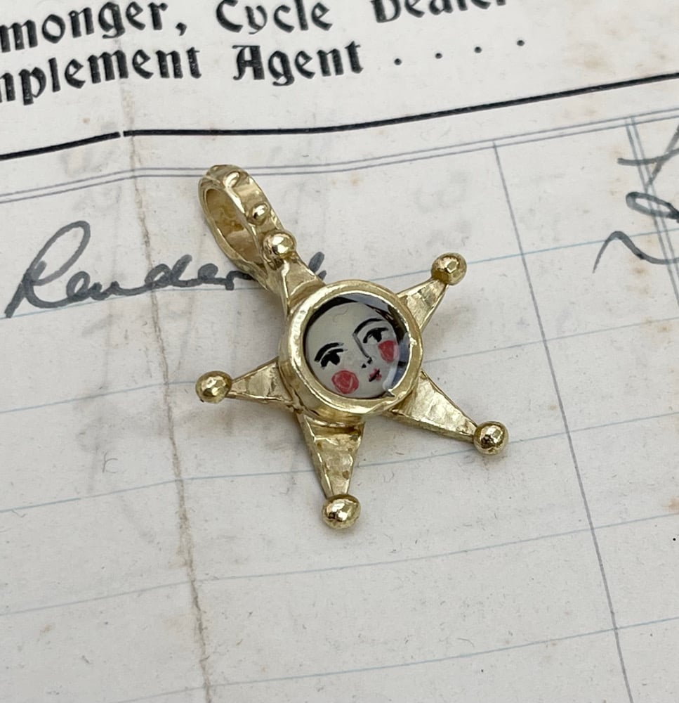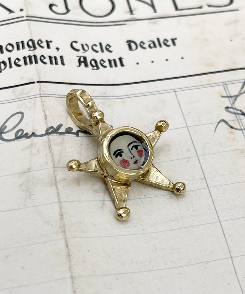 This pretty little star pendant has a hand painted face with rosy cheeks. She’s made from brass and looks lovely on a short or long chain. Her size makes her ideal to wear with other charms.