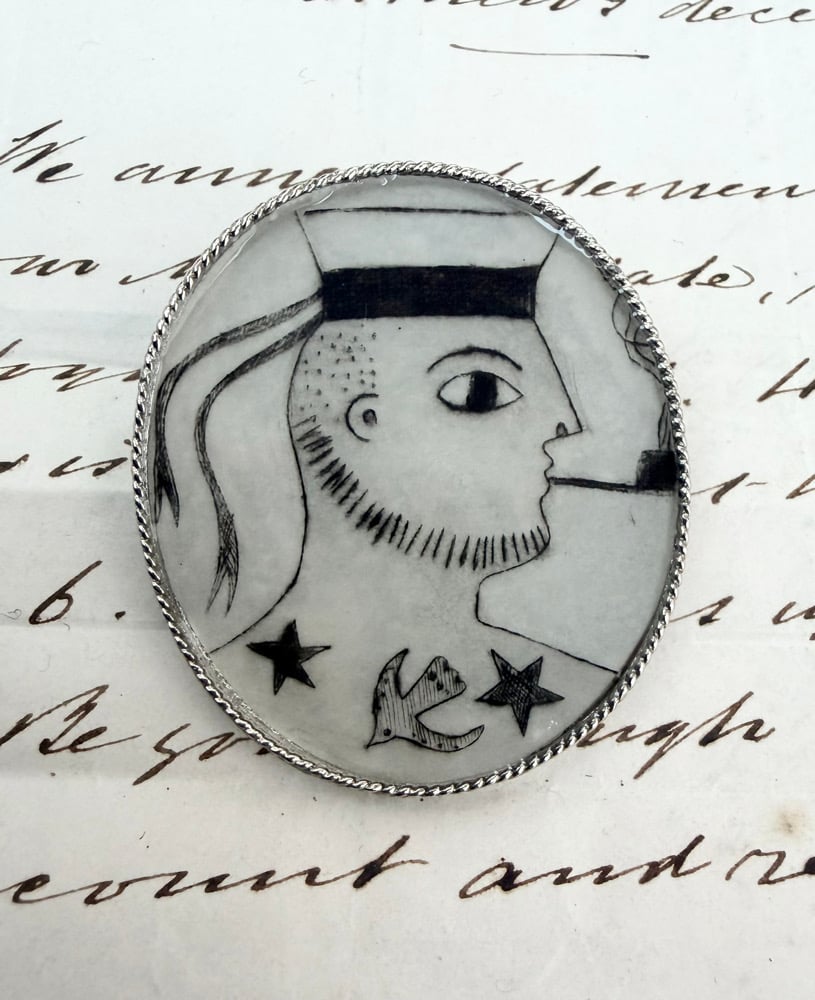 This little tattooed sailor is smoking a pipe and looking out to sea.