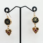 These chandelier style earrings have hand painted stars and below hand tiny hearts. The hearts have small lab grown rubies set within. They have 14ct gold filled hooks.