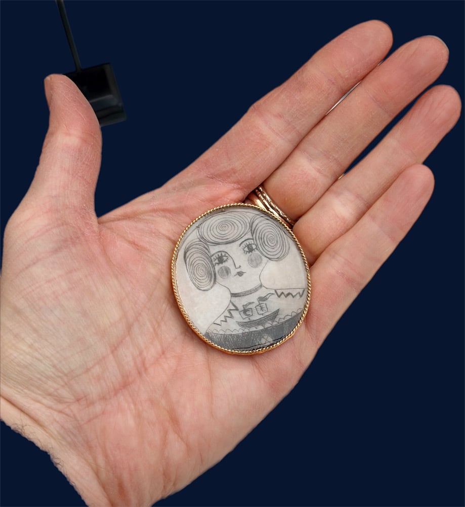 This tattooed lady is a hand printed dry point etching. She’s set within a vintage brass frame.